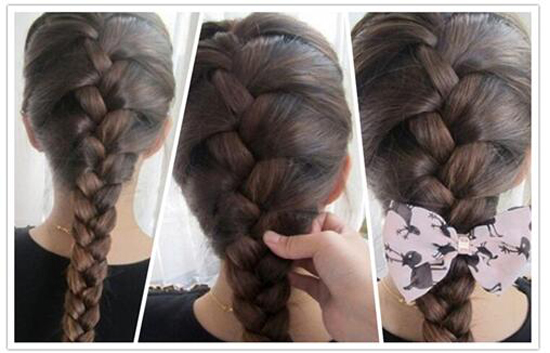 编到发尾时不要忘记使用橡皮筋扎好发辫,随后可用手轻轻揉捏辫子,让其变得自然蓬松,为了让你的扎发更美,建议你可用一款漂亮的发饰去装饰它。