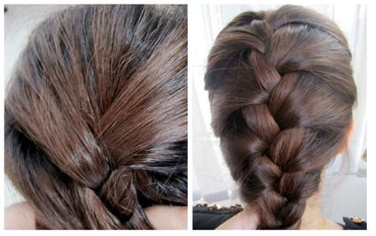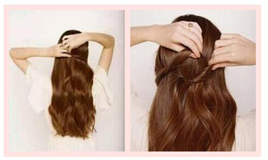 然后将另一侧的头发扭转后同样拉到脑后,将其放进刚才那个发束与长发之间的空隙里。