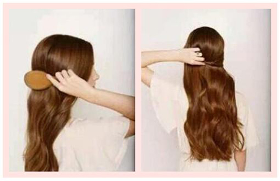 先用气垫梳子梳理你的及腰长发,可让它变得蓬松、柔顺,然后将一侧的头发扭转,拉扯在脑后,用发夹固定好。