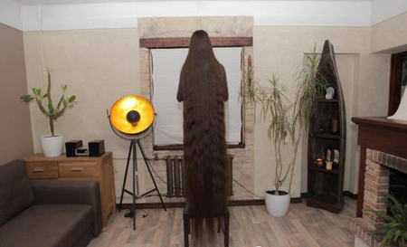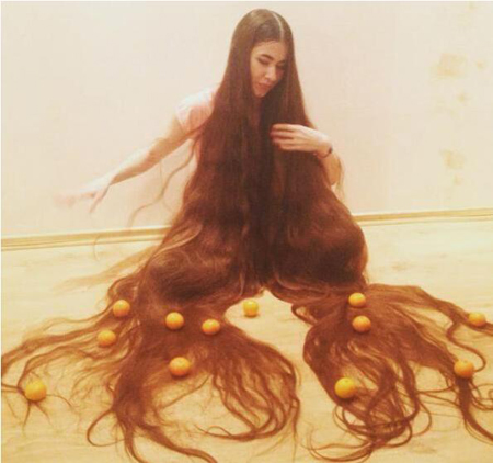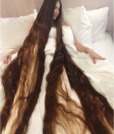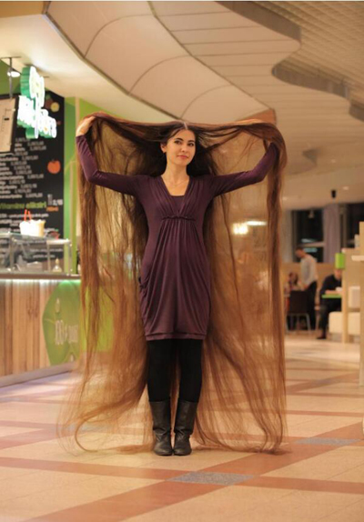 Aliia Nasyrova 是一位27岁的姑娘,她来自拉脱维亚。二十年来,Aliia 从来没有剪过自己的头发,头发的长度达到了7.5英尺(约2.3米),重量甚至超过了她家的猫的体重。(上图是 Aliia 举起了她两米多长的头发)