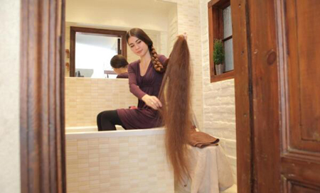 姑娘20年没剪过头发 梳头要花一小时。27岁的拉脱维亚姑娘Aliia Nasyrova 20年没剪过头发,头发的长度达2.3米,重量甚至超过了她家猫咪的体重。平时,Aliia梳头需要花一个小时,很麻烦,但是她自己乐在其中,Aliia说,她留的灵感来源于格林童话中的长发公主。