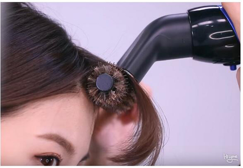吹出弯度后,最重要的就是加强弯度 这时候只要将圆梳放在浏海下(如上图)吹风机顺着浏海往下吹~最后在浏海发尾处稍微停留,让它的卷度可以更卷~~放掉后稍微用手拨松就完成啦。