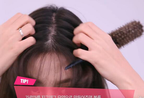 紧接着将浏海都拨到中间(如上图)~用圆梳固定在离发根约5分处,稍稍往发根的地方推进,再用吹风机吹~就能有如下图的空气感微弯度啦