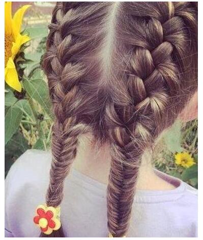 小女孩梳好看的辫子发型,蜈蚣辫双编发从上边开始往下梳,低层头发是鱼尾辫款式,双层编发很有些纹理分明的感觉,用发饰固定最后的编发发尾,造型最显精致风范儿了。
