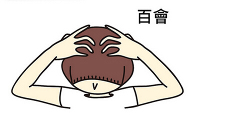 位置:左右耳尖延着头部直上,与鼻尖的延伸线交会在头顶的正中央,在交会处稍微偏后的地方,即是百会穴。