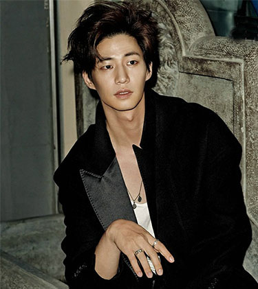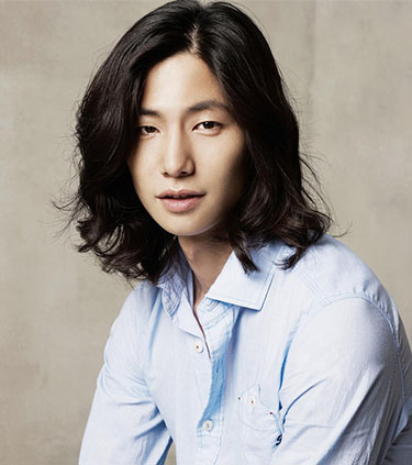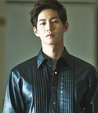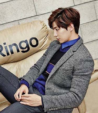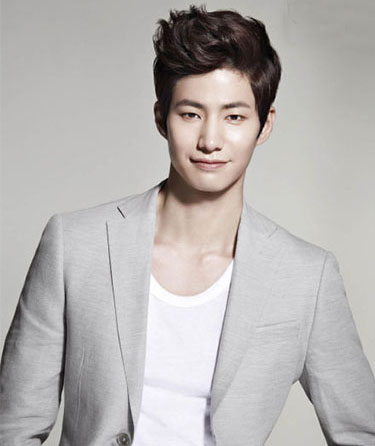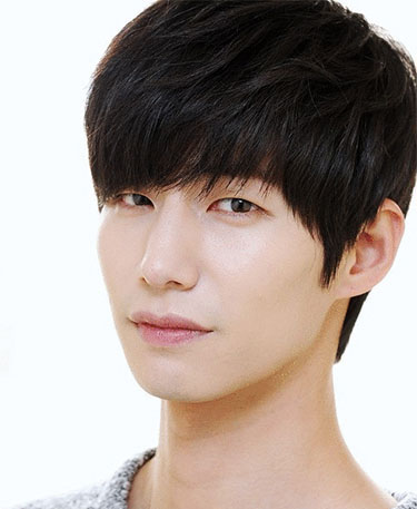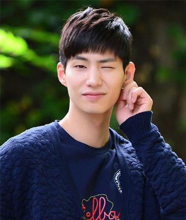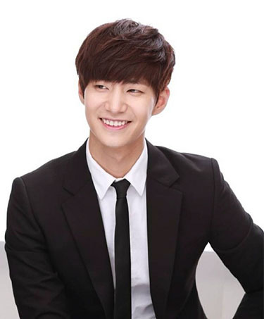 棕色染发,齐刘海的造型,搭配迷人微笑,展现阳光大男孩的形象。
