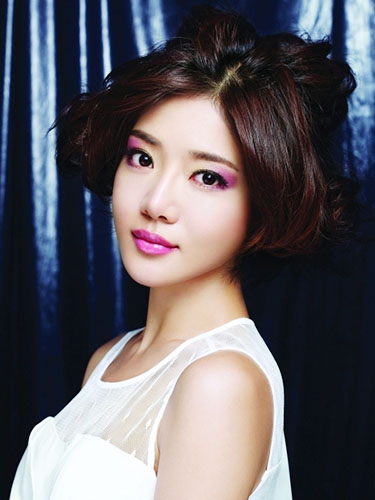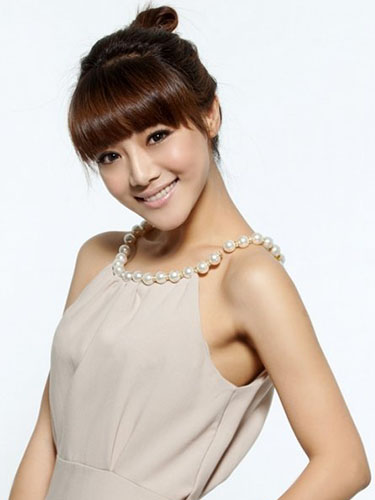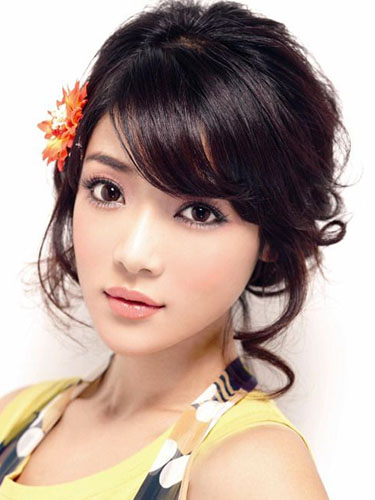 中分长刘海紧贴脸颊,头顶精心处理,形成好看的花苞状,打造时尚魅力的形象。