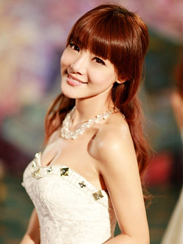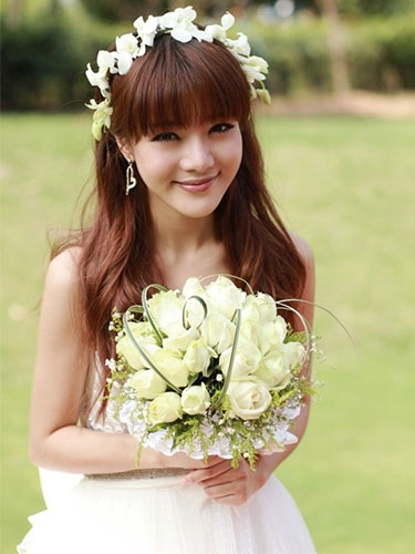 这是在《爱情公寓》里面的婚纱造型。齐刘海的微上加上鲜花点缀,棕色长卷发显示清新淡雅的气质。