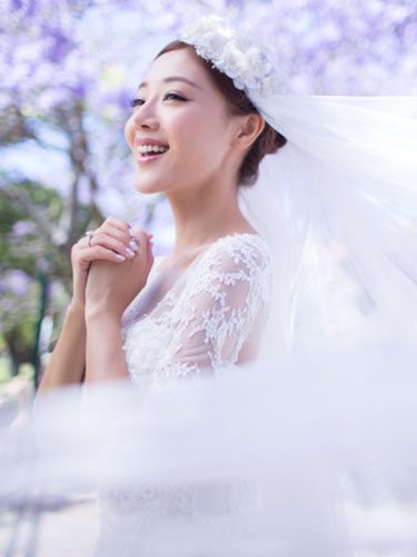 邓家佳一身洁白婚纱,头顶花状头纱,造型似仙女,脸上洋溢着幸福的微笑。
