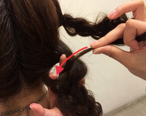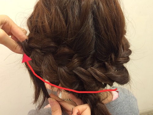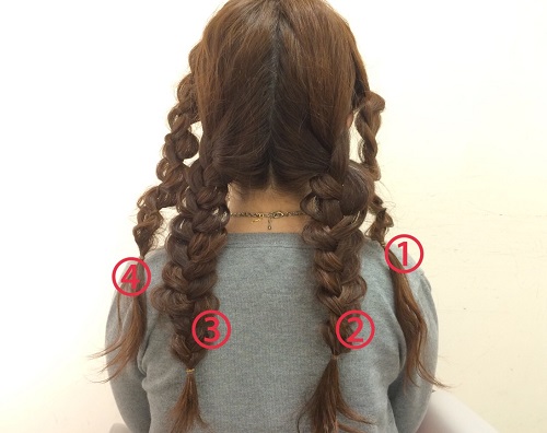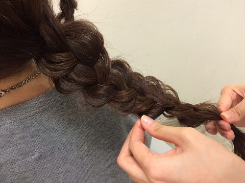 (3)参考以上照片将1号辫子穿过2号辫子中间(发根附近),同样的将4号辫子穿过3号辫子中间。