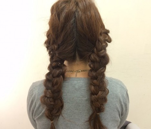 (4)变为两束辫子后将彼此交叉,右侧发束以发夹固定在左耳后附近,左侧发束以发夹固定在右耳后附近,发尾多出的部分用发夹固定藏起来。