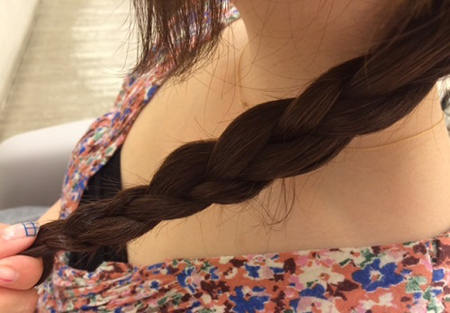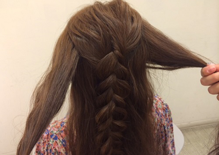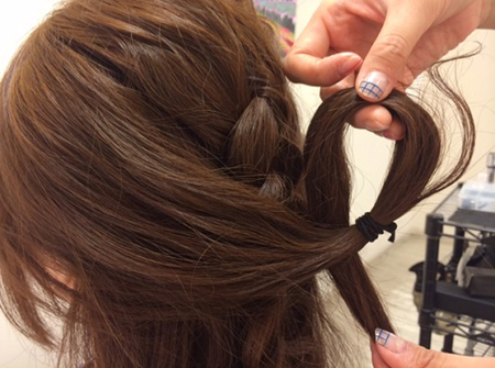 (4)将用橡皮筋固定好的发束由上方穿过。穿过后从发尾分成2束,一手抓1束向上拉紧。