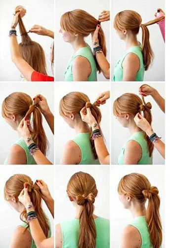 8. 把刚刚于留在下发的头发绕过两个圈圈中间,然后剩下头发绕在刚刚绑马尾的橡皮筋位置