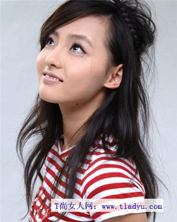 刘海呈现一九斜分,在一的那部分编织一条麻花辫置于耳后,而整个头发用梳子挑出蓬松感,看起来凌乱非主流却个性十足。