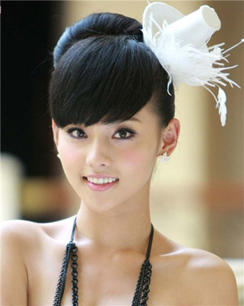 梳得简单而整齐的大丸子头,侧向一边充满个性,前额大片的刘海微微向一旁倾斜带着弧度感,丸子头另一侧用白色的小礼帽做装饰,整款发型充满时尚。