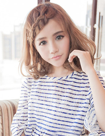 卡哇伊范的亚麻棕色卷发,蓬蓬的烫卷到及肩的长度,简约时尚,刘海部位的别致编发绝对是点睛之笔,瞬间轻熟女变小萝莉。
