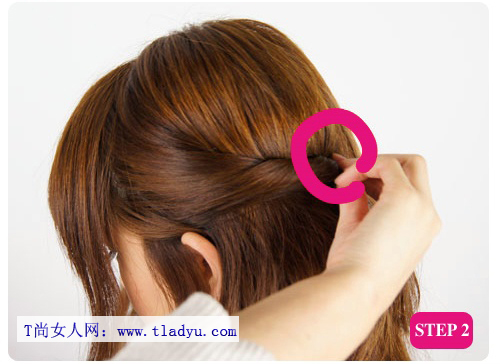 将分出的头发向上旋扭,绕至后脑勺中部,用U型夹固定。