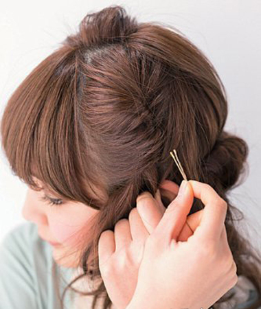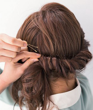 4、然后左侧的头发也向内侧拧紧,使用发夹固定。