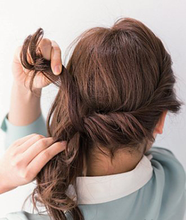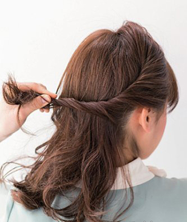 1、把头发固定在右侧的太阳穴上方位置,向内侧拧转。