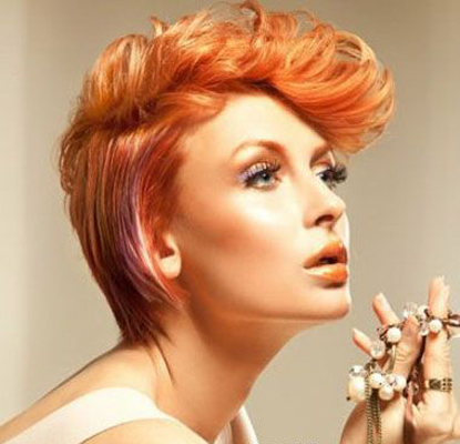 金色长刘海向上卷翘,个性十足,右侧耳际部分垂下的紫色挑染短发十分惊艳。蓬松的设计能让你头型更加饱满哦。