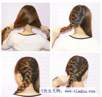 Step2:将左边的发型编织成一个大大的蜈蚣辫,如果不会编的话,可以参考麻花辫,编织麻花辫的过程中,不断的从两侧发丝中抽取一束编织进来,就可以了。