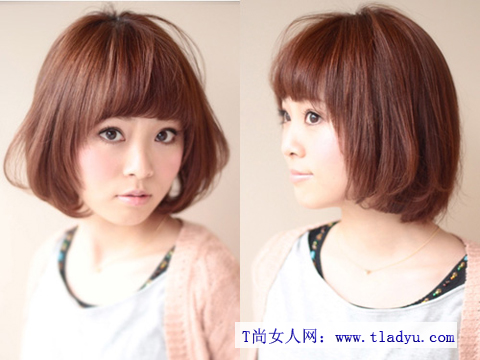 齐刘海的设计能带出一种乖乖女的感觉,小厚重的感觉塑造出乖巧的造型风格,铜红色的发色染色既时尚又百搭。