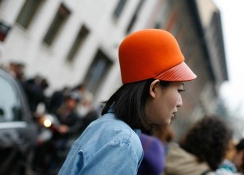 亮眼的橙色帽子饱和度极高,毛呢和皮革拼接的材质也是今年的潮流趋势,让你赚足眼球。