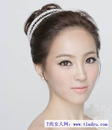这款发型采用低邦的发髻扎法,相对比较简单,但效果很不错,精致的瓜子脸能展露无暇,搭配珍珍链的发饰时尚感十足!