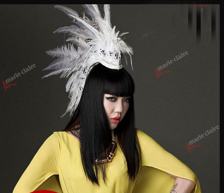 浓黑色的长发搭配上夸张的白色羽毛头饰,大气风范尽显。而身穿的的黄色斗篷,连带掐腰的Pose,把吴莫愁的大气发挥到极致。然而造型师不会只是注重这几方面的打造,一些小细节更是造型成功的妙绝,黑色的指甲与黑发相呼应,绿色手镯与腰带相呼应。最重要的就是莫愁左胳膊上的纹身让我们感受到了她独特的魅力。