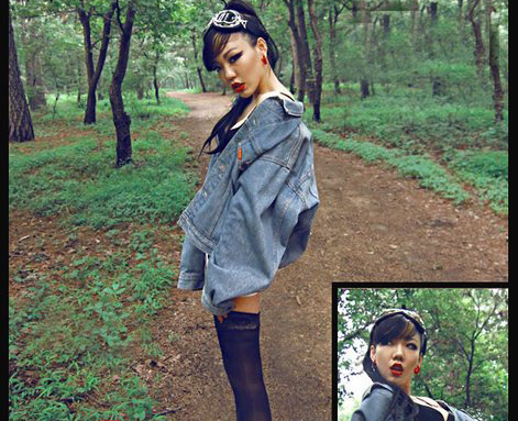 梳着长长的马尾,刘海侧分,将墨镜戴在头顶做发箍让原有的平平马尾多了几分时尚感。身穿宽松牛仔外套,以及黑色的、丝袜走在树林中,更加的狂野大胆。