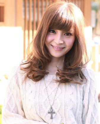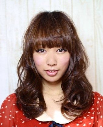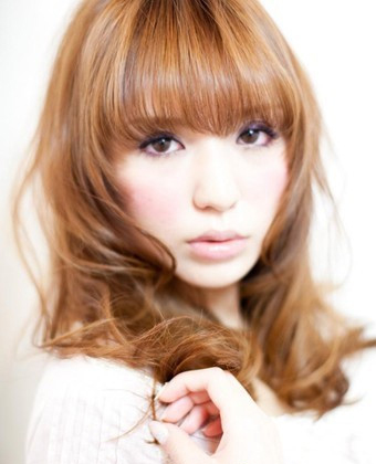 厚重的齐刘海显得既可爱又能够减龄,层次的卷发制造出丰盈的造型感。