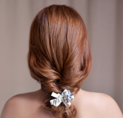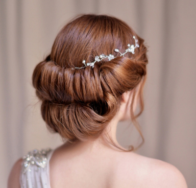 一款优雅而纯洁的新娘盘发,总是给人很圣洁的感觉,同时也展现高贵典雅的新娘气质,把所有的头发都盘起来,在后脑勺弄成一个髻环,搭配小珍珠冠发饰,散发淡淡古典韵味。