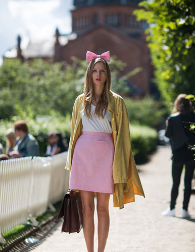 超大可爱的蝴蝶结,立马把人带回了童真年代!从裙子到纯色,也不忘了粉粉的呼应发箍上的蝴蝶结。不过,换做是我,如果随随便便就这样带个发箍出去,大概会被朋友叫白痴吧~