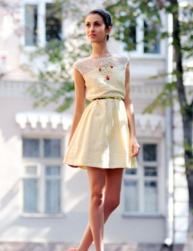 乳黄色的小连衣裙,拼接双肩锁骨处的镂空设计,清清淡淡的色调看,反倒衬托出了五官天生的浓郁~简单挽起的的发髻,用一个黑色的发箍固定一下