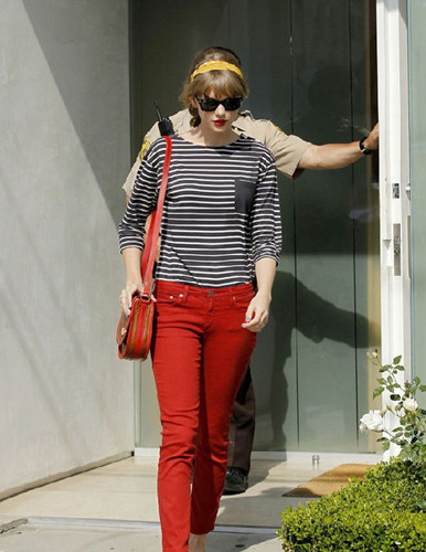 Taylor出现在在加州洛杉矶的NEIL LANE珠宝店,头戴浅黄色发箍,身着条纹上衣,大红的裤子和包包,还有红唇精气神十足,最近的街拍必不可少的会发现她都带着个墨镜。