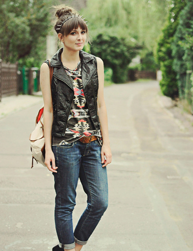 有型搭配示范在这里哦~双肩包、黑马甲、牛仔裤这些单品你也许都有,但是你想过这么搭吗?最关键的就是发箍哈,铆钉发箍绝对是亮点哦!