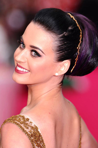 将细细的金色珠串发箍作为发带定型在发髻处,恰到好处的点亮了沉闷的紫色。