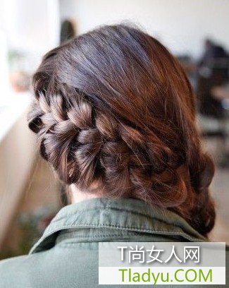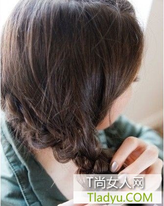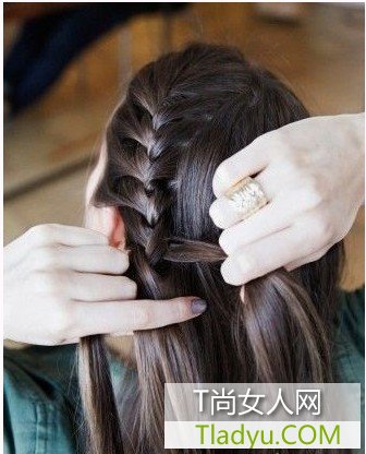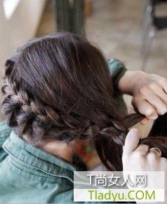 一直将头发辫到右侧,同时把右侧的头发一点一点的加进发辫中去,让发辫沿着左侧头部和后脑一直到达右侧。