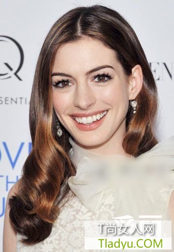 安妮-海瑟薇的这款富有欧式复古味道的卷发,彰显优雅高贵的名媛气质。最大亮点在于中分的S卷刘海造型,与复古卷长发 完美 混合,并利用浅色挑染来增加光泽度。