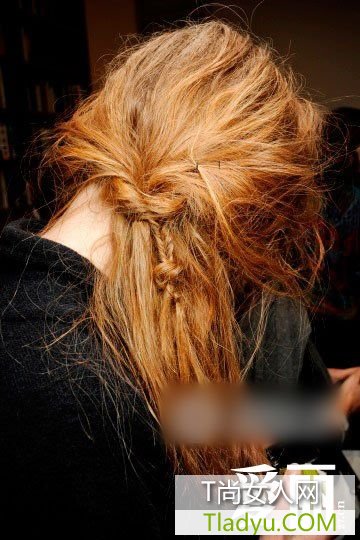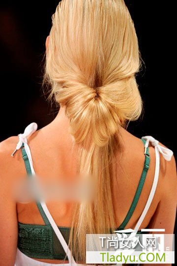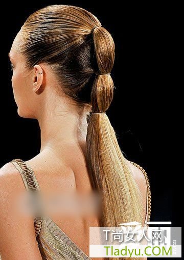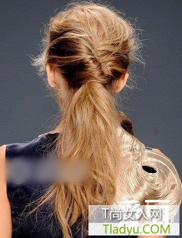 来自Rodarte 2011秋冬秀场的马尾在本季T台的马尾造型中可谓独树一帜,非常抢眼。如风刮过凌乱感长刘海和松散大鱼尾辫马尾造型,搭配复古的发饰或麻花辫子装饰,海边度假与欧式复古的混搭非常亮眼!将头发分成1:2:1三份,两边的小发束向内扣固定中间的大份发束,打造松散的大马尾造型。可以用发簪来帮助固定和装饰。
