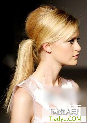将发顶制造蓬松的立体效果,搭配低扎马尾,时尚前卫又不乏可爱。从正面看很强势大气,从侧面看则富有立体雕塑的线条轮廓和层次感。适合脸型本身较完美的鹅蛋脸。马尾部分不要扎太高,紧贴脖子,与蓬松顶发形成顺畅流线型的侧面轮廓。