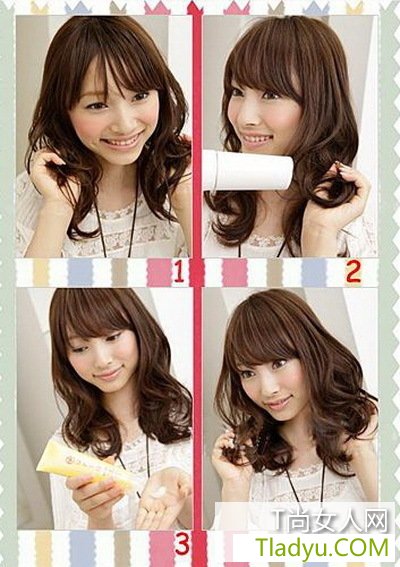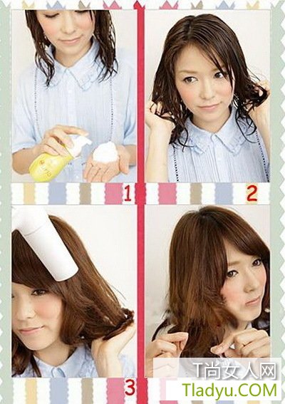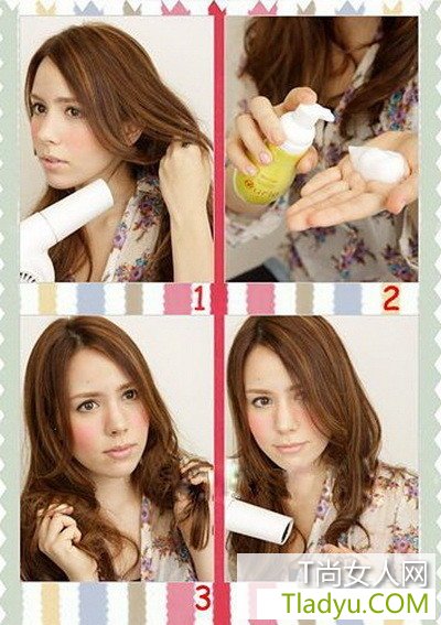 Step 4:用吹风机顺着发尾卷曲的方向,将头发吹干、定型。