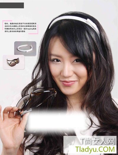 淑女风格的清新发型,偏自然色的头发造型,灵动的卷发发丝,发型十分动感显嫩,白色发箍 墨镜,尽显都市轻熟女的活力可爱。