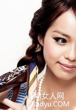 步骤3:辫子从头部左上方一路编往右下,编到尾端用黑色橡皮筋固定住。
