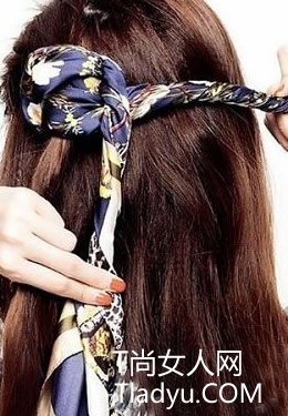 步骤1:头发左上方取一小束发丝用橡皮筋固定,然后把丝巾绕住发束打两个单结固定住。