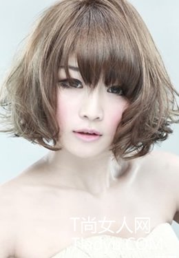 蓬松的短发梨花头,发丝很凌乱显得个性不羁,参差不齐的过眉刘海将脸型掩盖了三分之一,再结合脸颊两边的秀发将脸型拢得更加小巧迷人。浅亚麻色的发色很混血女孩范儿。这款短发梨花头是肉感的圆脸女生必备之选哦!
