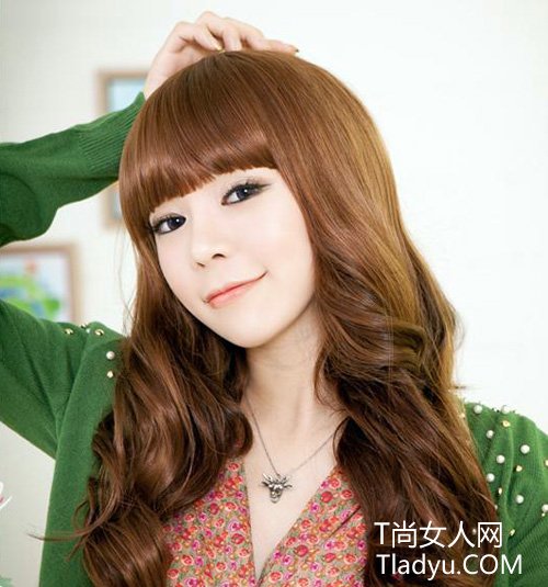 半圆弧度刘海波浪卷发很有气质,栗子发色有提亮皮肤颜色的效果。