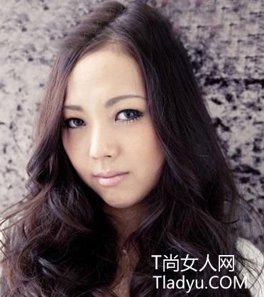 将头发大部分侧摆到左边,魅力十足的一款外翻卷发。右边只留下厚实的中分刘海。这样首先可以缔造出成熟女性感觉,还能将多余的肉肉和过高的额骨全部藏起来。小脸效果简直满分。