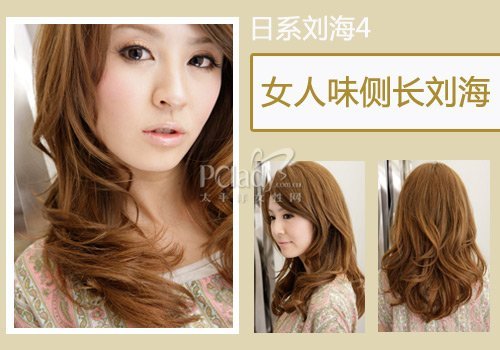 刘海特点:刘海的发际很自然,长长的刘海侧在一边,配合卷发,不错哦。