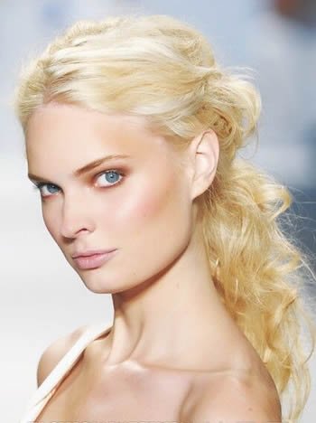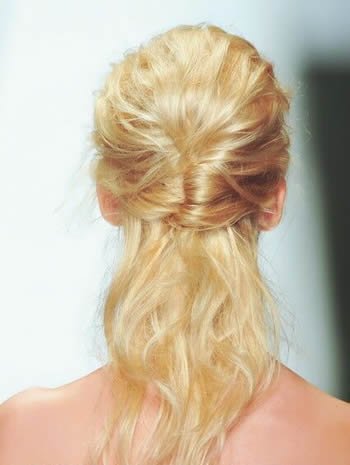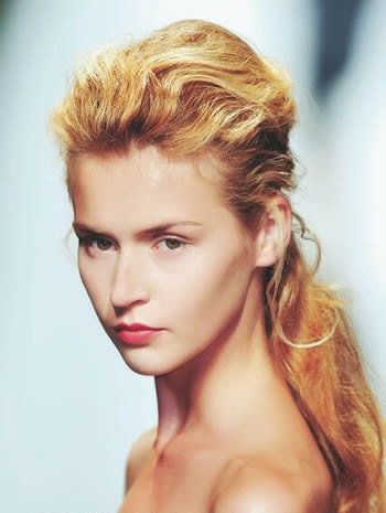 整体的波浪弯曲感,慵懒中透出清新的感觉。蓬蓬的发顶给人轻松写意的印象,半盘发的马尾动感十足。